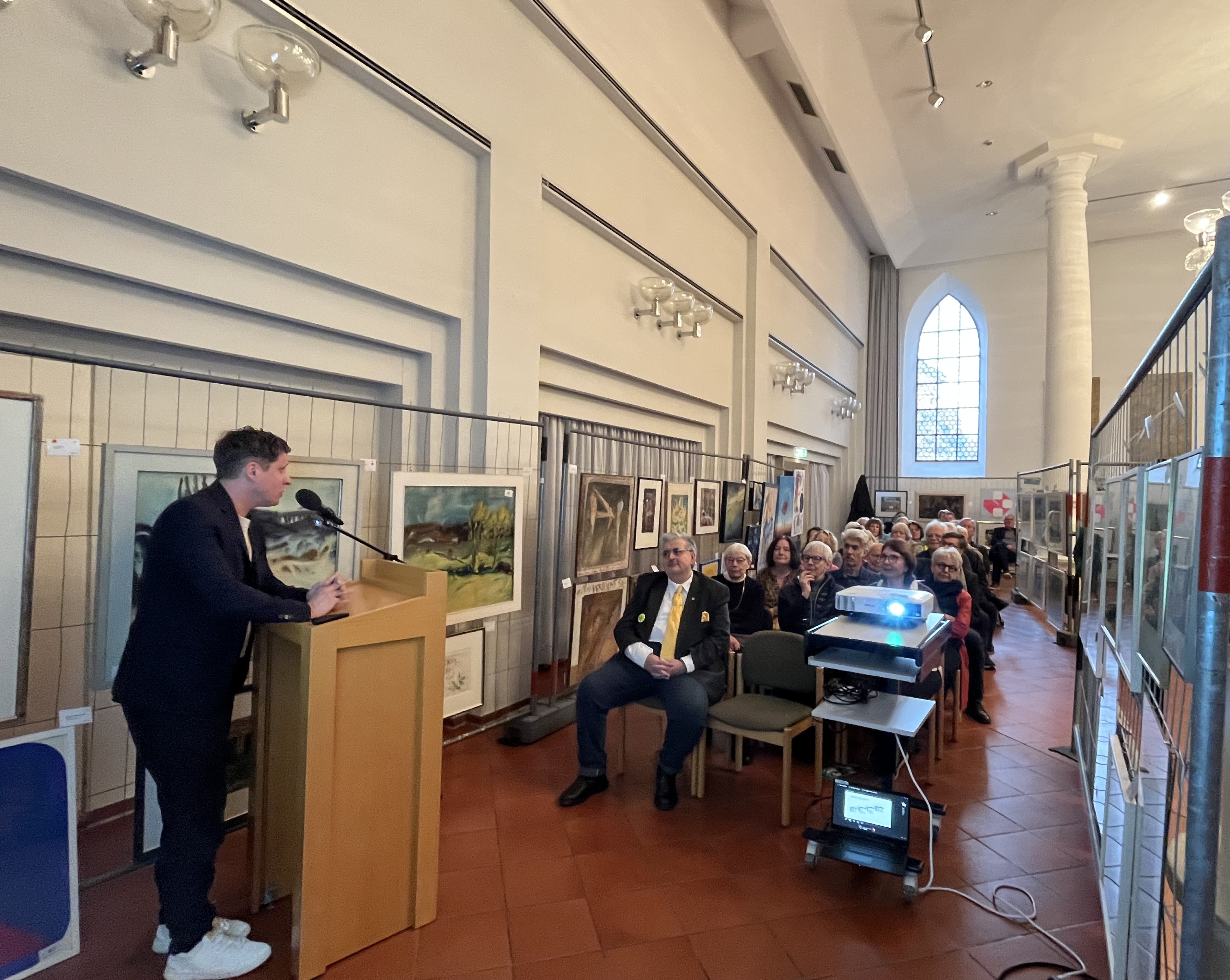 Ein besonderer Höhepunkt des Wochenendes war die Matinee am Sonntagvormittag, dem dritten Ausstellungstag, zu dem der Präsident den seit 2024 amtierenden Leiter des Reutlinger Kunstmuseums Stephan Rößler als Referenten begrüßen durfte. Herr Rößler begeisterte die zahlreichen Gäste mit seinem begeisternden Vortrag, der gleichermaßen eloquent, erfrischend und informativ war. Unter dem Titel „Kunst ist, wenn man trotzdem lacht. Positionsbestimmungen eines Kunstmuseums“ sprach er über die gesellschaftliche Rolle heutiger Museen, über die Verantwortung im Umgang mit Geschichte und über die Chancen, Museen offen, lebendig und zugänglich zu gestalten. Seine Gedanken regten zu Gesprächen an, die beim anschließenden Frühschoppen in entspannter Atmosphäre vertieft wurden.